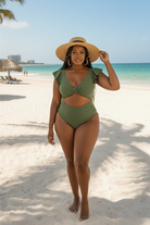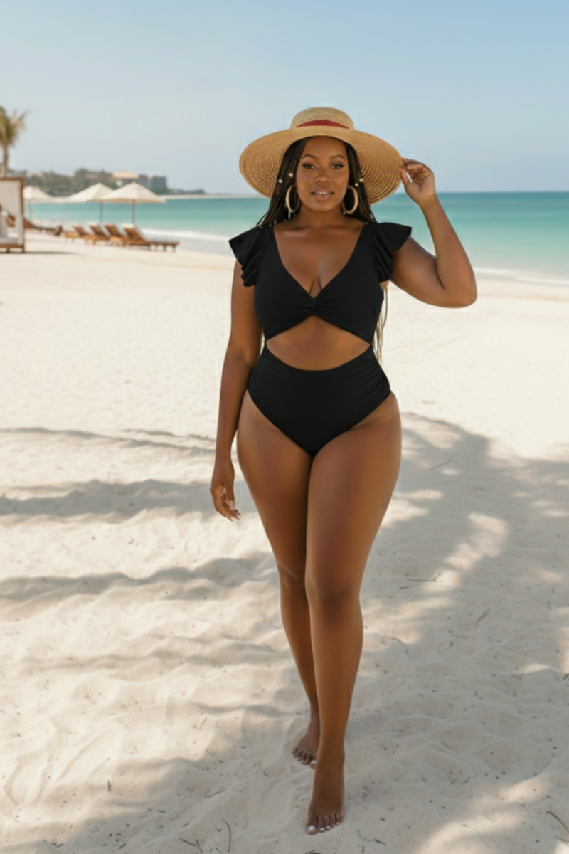 Make a romantic yet modern statement in this deep V-neck monokini, thoughtfully designed with soft ruffled sleeves and elegant front-and-back cutouts that sculpt the waist and accentuate your natural shape. The high-waist, hip-enhancing silhouette offers flattering coverage with a subtle cheek-peek finish—striking the perfect balance between bold confidence and refined sophistication.